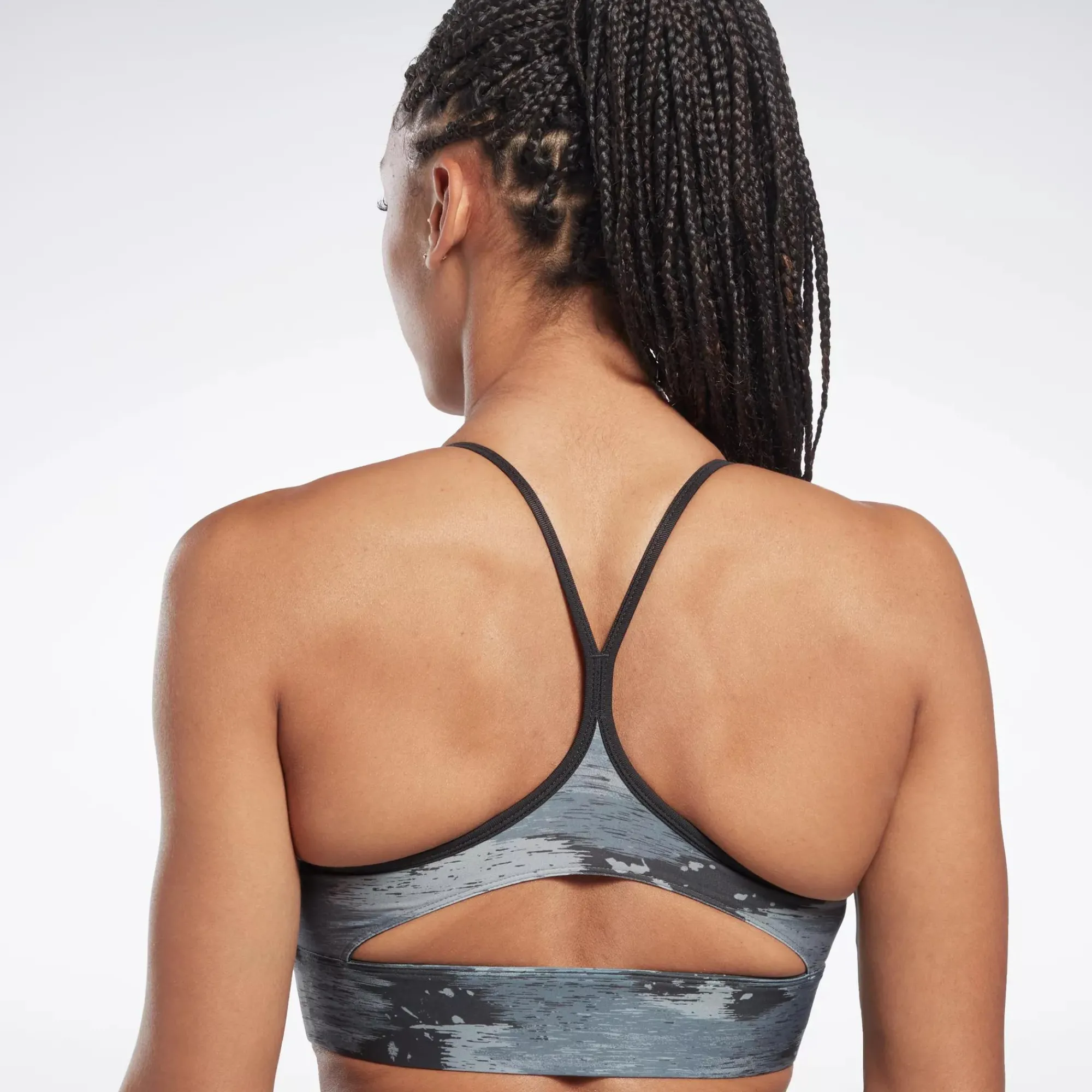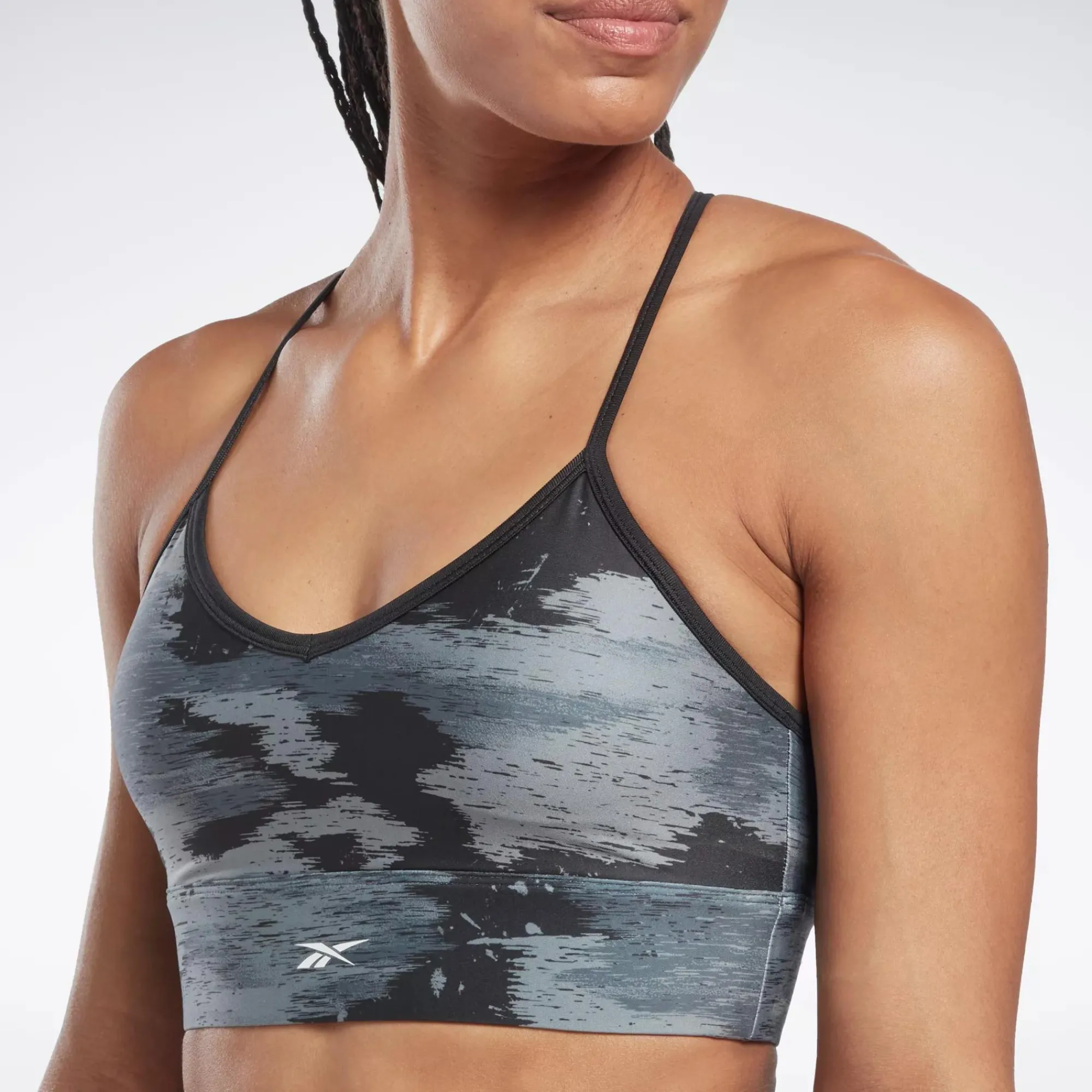 Find Another Gear In Your Most Challenging Workouts. This Reebok Sports Bra Is Designed For Low-Impact Workouts Like Pilates Or Barre. It Has A Flattering V-Neck And Removable Pads For Personalized Coverage. A Brushstroke Effect Gives The Camo Print A Distinctive, Modern Look.